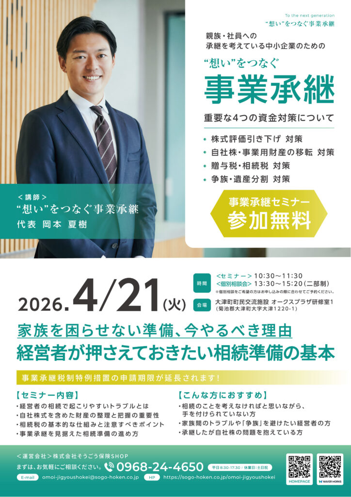 4/21㈫無料【親族・社員への承継を考えている中小企業のための事業承継セミナー】