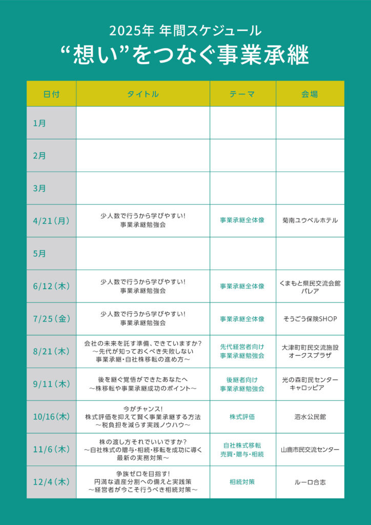 今後も、地域の経営者の皆さまの安心で円滑な事業承継をサポートするため、引き続き勉強会や個別相談を継続して開催してまいります。今回ご参加いただけなかった方も、ぜひ次の機会にご参加ください。